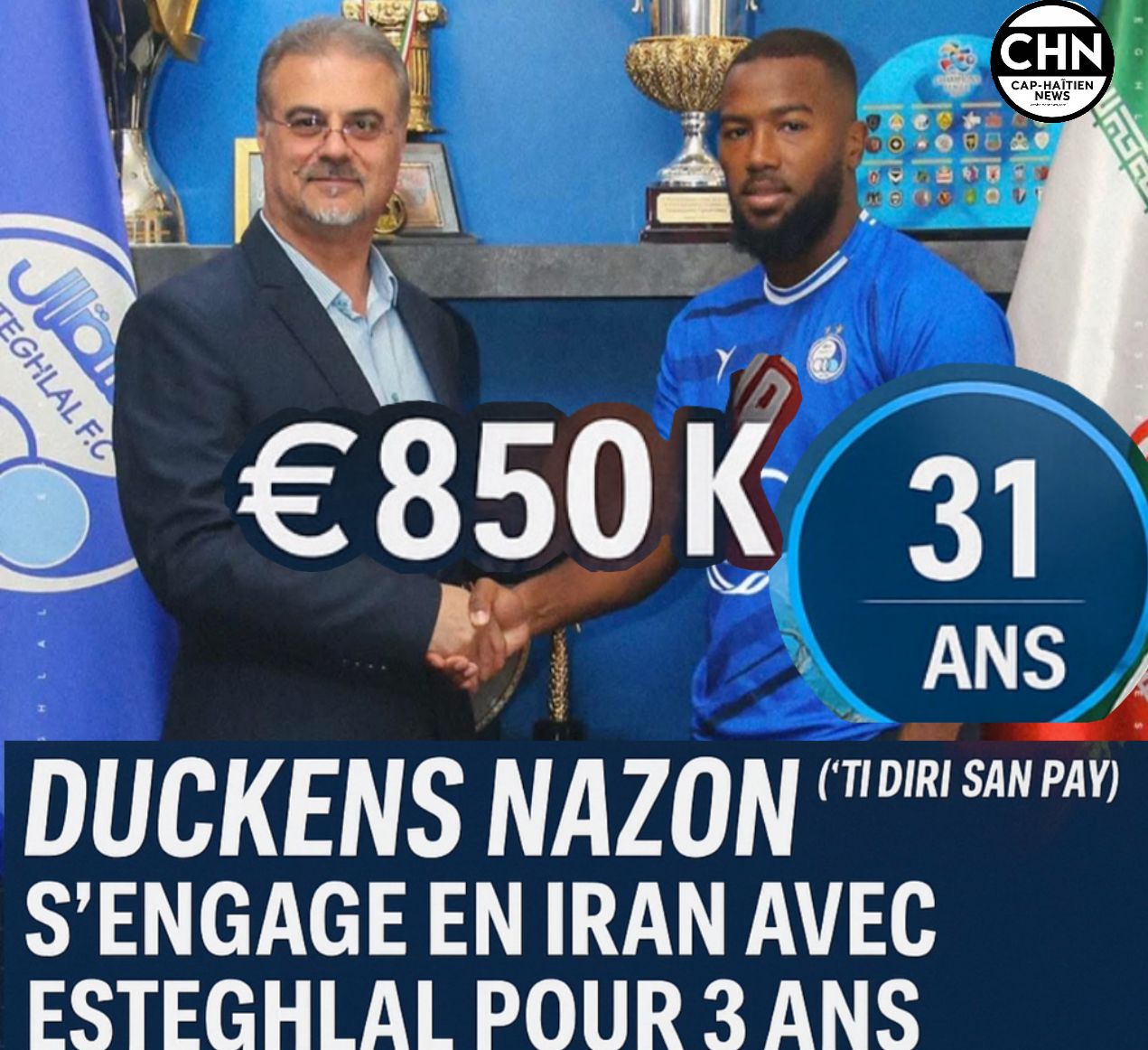 Après avoir tourné sa bosse un peu partout en Europe — de la France à l’Angleterre, en passant par la Belgique, la Bulgarie et la Turquie — le meilleur buteur en activité des Grenadiers (40 buts en 72 sélections) pose désormais ses valises au Moyen-Orient, au pays des Mollahs. À 31 ans, Duckens Nazon rejoint Esteghlal FC, club historique et l’un des plus titrés d’Asie, avec 10 championnats d’Iran, 8 Coupes Hazfi et un titre continental majeur à son palmarès. Le transfert est estimé à 850 000 € (valeur marchande actuelle : 1,2 M€), selon Transfermarkt. L’attaquant haïtien compte également revenir en force avec la sélection nationale dès le 5 septembre 2025 pour le choc des éliminatoires du Mondial 2026 face au Honduras, un match qui se disputera à Curaçao au stade Ergilio Hato.