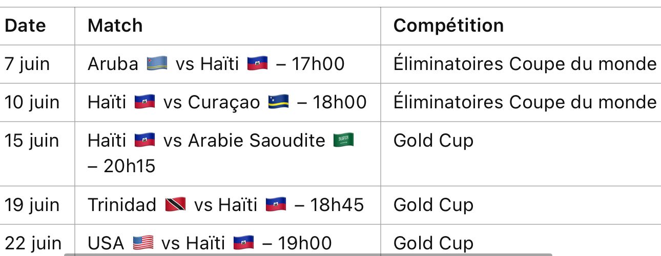 À partir de ce 7 juin, la sélection haïtienne s’engage dans une série de cinq rencontres officielles en l’espace de quinze jours. Un calendrier resserré, sans match de préparation, qui combine les deux premiers tours des éliminatoires pour la Coupe du monde 2026 et la phase de groupes de la Gold Cup. Une séquence à haute intensité, qui contraint l’équipe à maintenir un niveau de performance constant, tout en absorbant l’exigence physique d’un tournoi condensé.